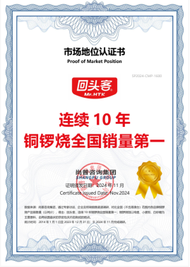 2024年10月,尚普咨询集团向回头客食品集团股份有限公司 (以下简称“回头客”),旗下的铜锣烧产品和华夫饼产品颁发市场地位认证书。此次回头客荣获尚普咨询【回头客,连续10年铜锣烧全国销量第一】【回头客,连续5年华夫饼全国销量第一】两项权威认证,表明回头客凭借其卓越的品质保证,赢得了市场的广泛认可。